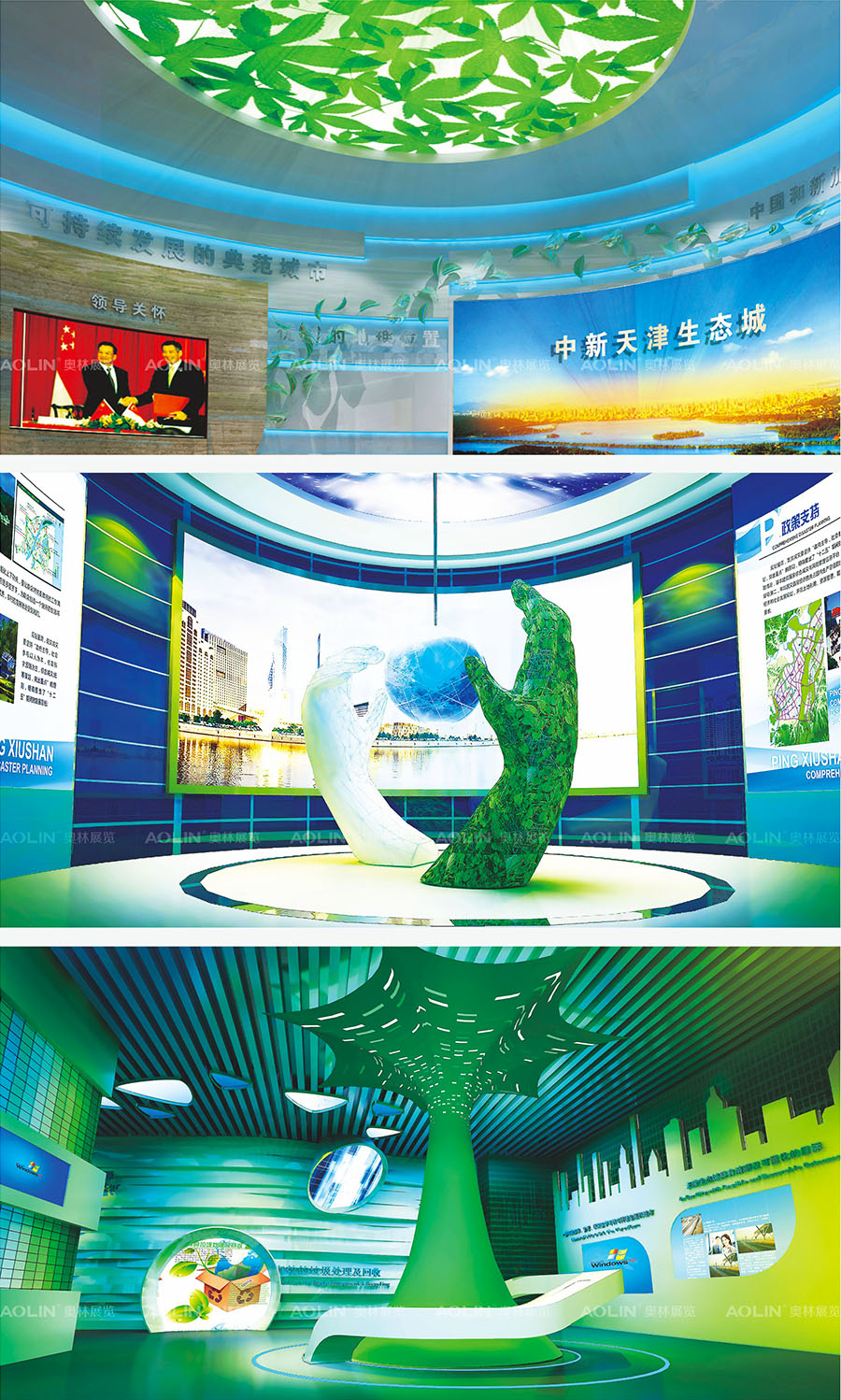 坐落于天津滨海新区的中新天津生态城,是中国与新加坡合作的项目,也是世界上第一个国家间合作开发的生态城市。展厅以抽象的生态语言为设计的总体理念,将生态城的发展设想和规划细则全面阐释。