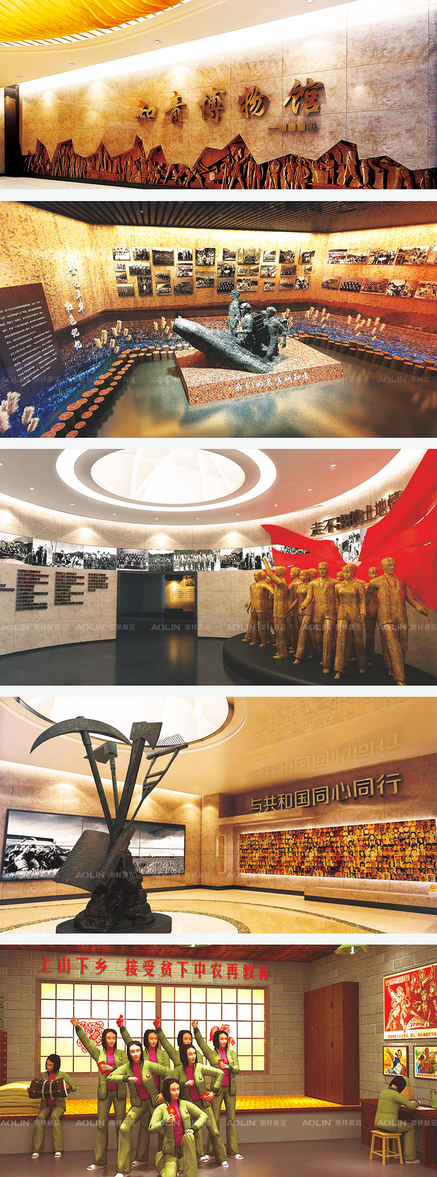 展馆以「金色年华、红色记忆」为主题,结合展馆基调,抽取出象征怀旧沉稳的灰色,代表年华和收获的金黄色,体现当时时代色彩的红色作为空间主色调进行展示。前厅主题墙以古朴的石材配合浮雕长卷,将难忘的知青时光凝结。